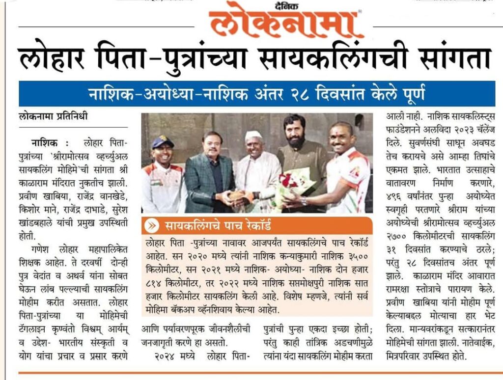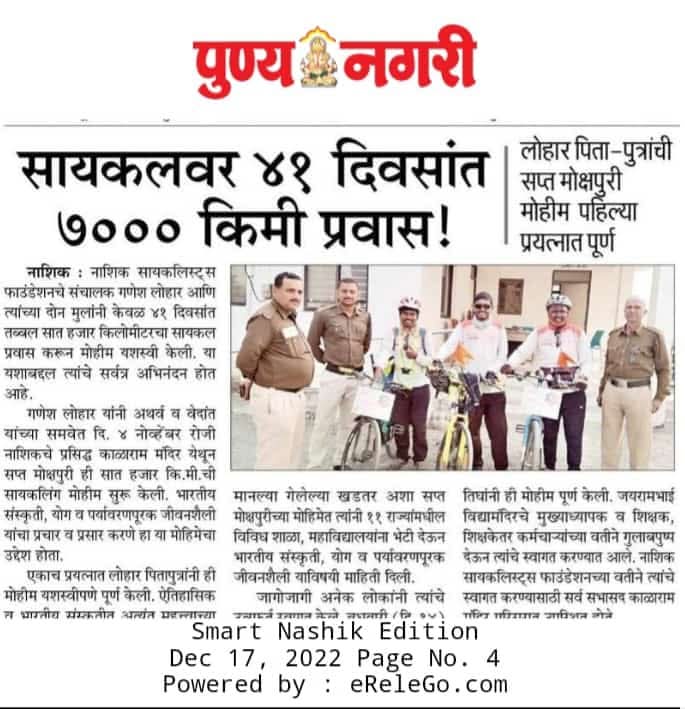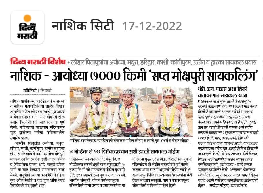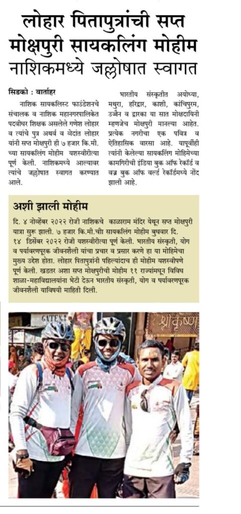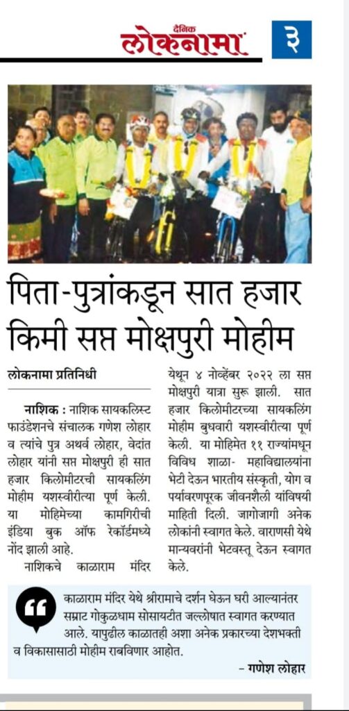 Mr.Ganesh Lohar, Age 50, And His Two Sons Vedant Lohar (Age 25) & Atharva Lohar (Age 20), Natives Of Nashik, Maharashtra, India. Has Set A Record, For Achieving First Father and Sons, The Longest 7000 KM Bicycle Journey For the ‘Sapt Mokshapuri Cycling Expedition 2022’, From Nashik To Sapt Mokahapuri & Return to Nashik. During this ‘Sapt Mokshapuri Cycling Expedition” they visited the seven Sacred places Ayodhya, Mathura, Haridwar, Kashi, Kanchipuram, Ujjain And Dwarka of India.