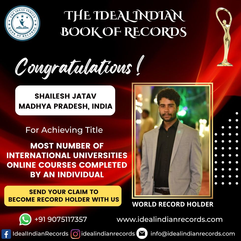 Most Number of International Universities Online Courses Completed By An Individual Shailesh Jatav, DOB: 16/07/1999, From, Dist. Shahdol, Madhya Pradesh, India. Has been appreciated for completing nineteen (19) Online Certified Courses from different International Universities on various subjects. He has Read More …