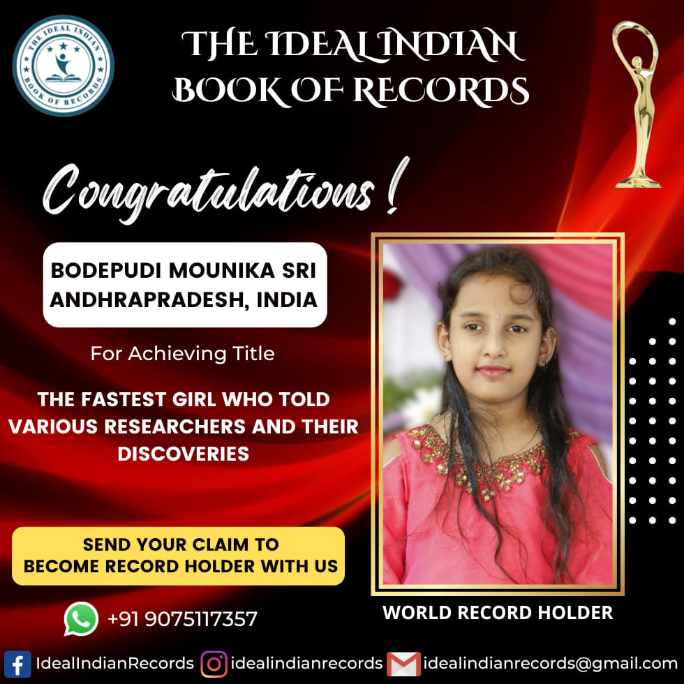 The Fastest Girl Who Told Various Researchers And Their Discoveries Bodepudi Mounika Sri (DOB : 06/12/2012) D/o. B. Ramarao and Smt. Naga Swpna, Native of Guntur, Andhra Pradesh, India.She has set Record by telling a total of 108 various Researchers Read More …