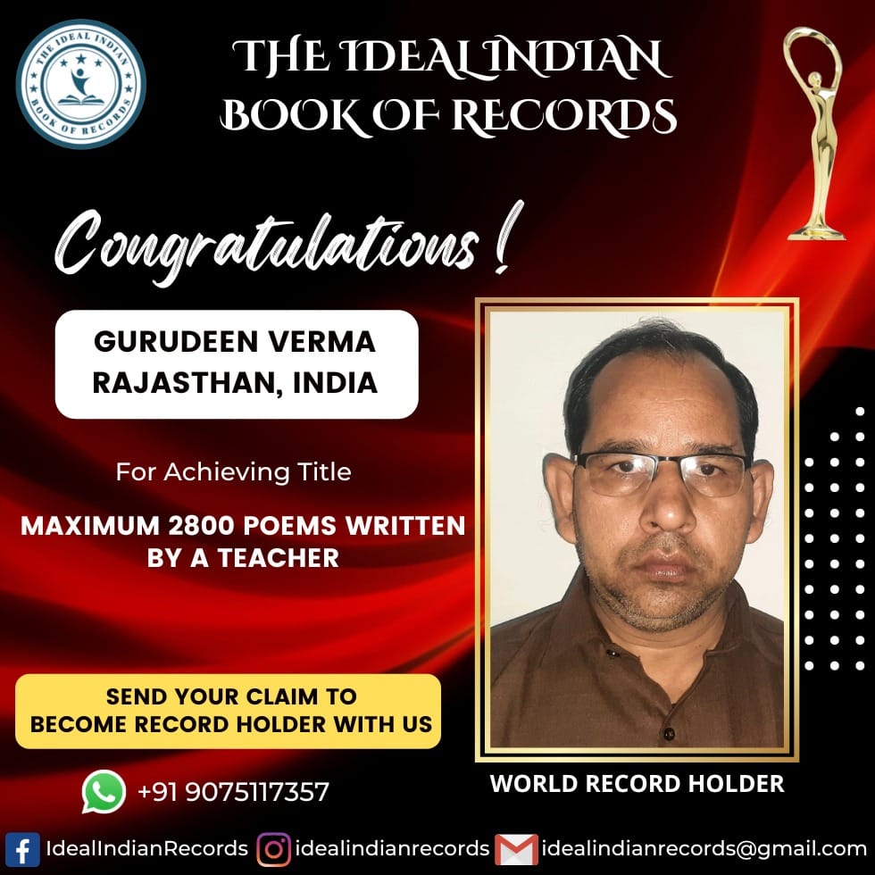 Maximum 2800 Poems written by A Teacher Gurudeen Verma, A Teacher And Well Known Poet, Author, and Native of District Sirohi, Rajasthan. He Has Set The Record By Writing Maximum Poems More Than 2800. His Poems Is Published In More Read More …
