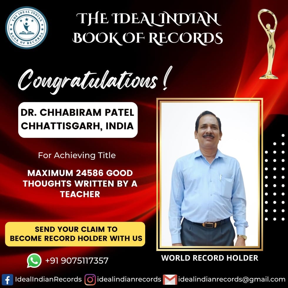 Maximum 24586 Good Thoughts written by A Teacher Dr. Chhabiram Patel, A Teacher Native of Mahasamund, Chhatisgarh. He Has Set The Record By Writing The Maximum Number of 24586 ‘Good Thoughts And Anmol Vichar’ In His 12 Self-Authored Book Which Read More …